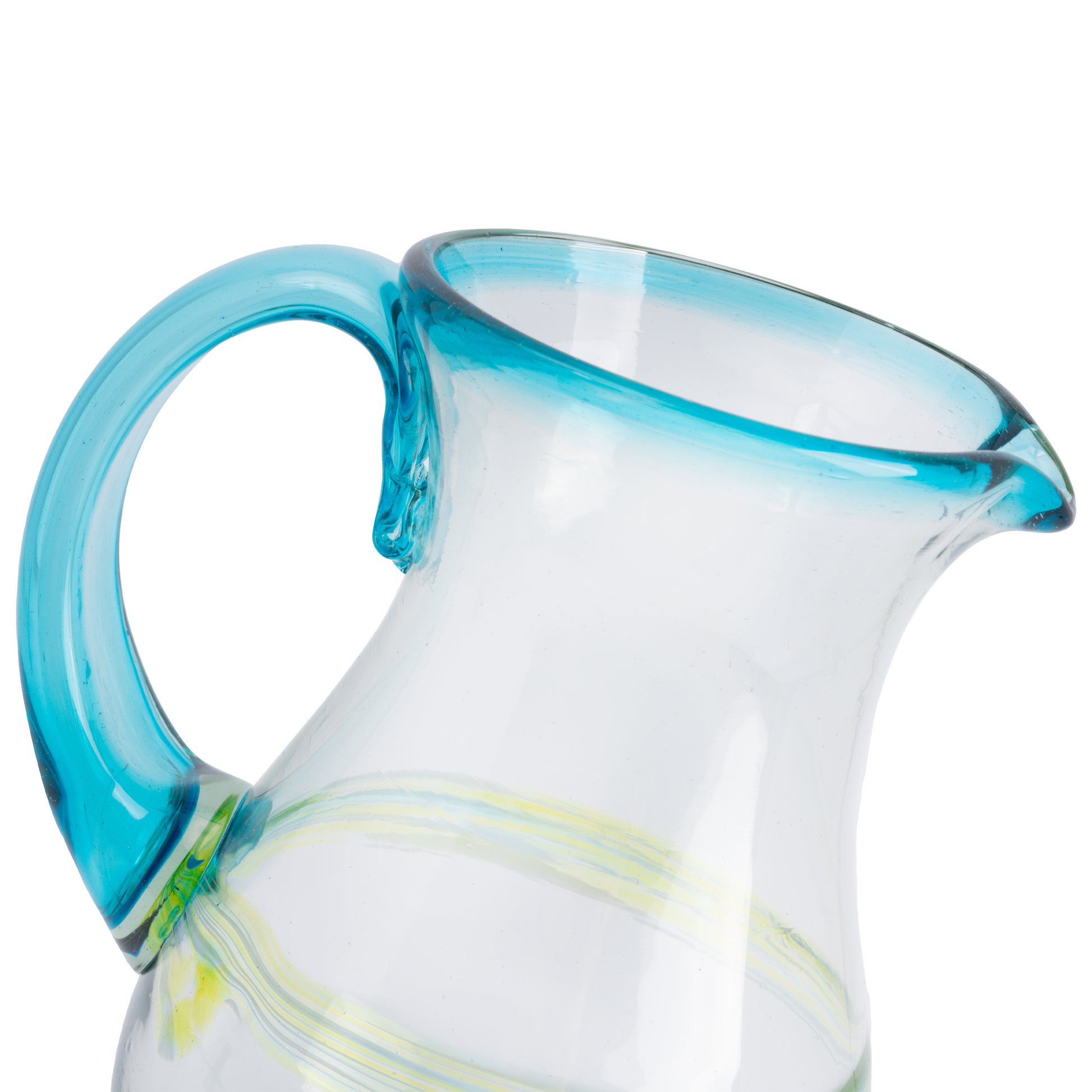 The 2.5 L pitcher is part of our signature mouthblown glass line and features a stunning aqua blue rim and aqua blue/lime green band around the middle. The pitcher can be combined with any of our other glasses.